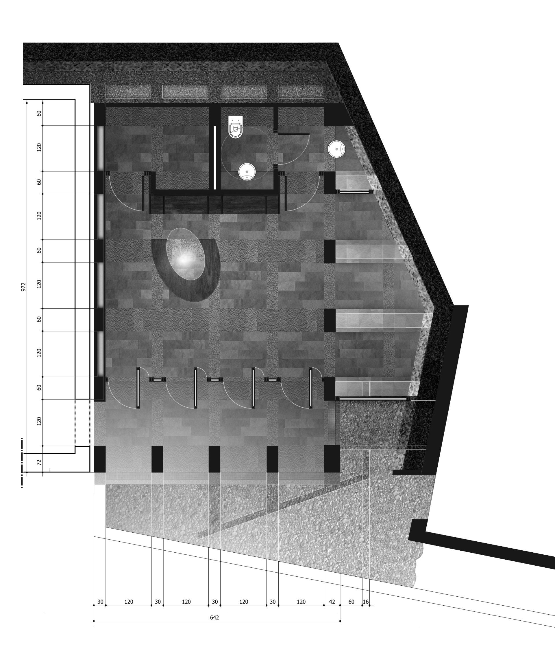 Al piano terreno si trovano i locali della nuova biglietteria del Museo. Sul soffitto, tra i due piani, un foro vetrato mette in comunicazione visiva gli ambienti dell'edificio. Nel foro, un lucernario rivestito in foglia d'oro, riverbera e moltiplica la luce naturale.
