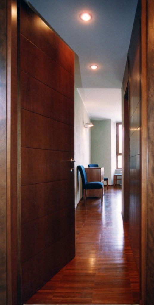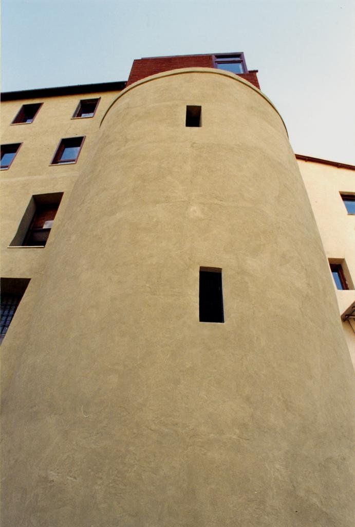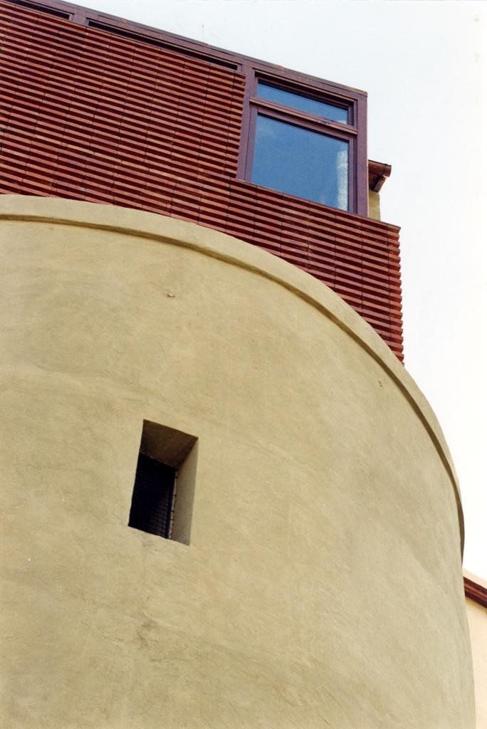 I collegamenti verticali, scala e ascensore, sono contenuti dentro un nuovo volume ligneo che a sua volta si inserisce all’interno dell’antica torre delle mura, liberata, come il resto della facciata, dalle superfetazioni e reintegrata volumetricamente con una cortina di mattoni faccia a vista.