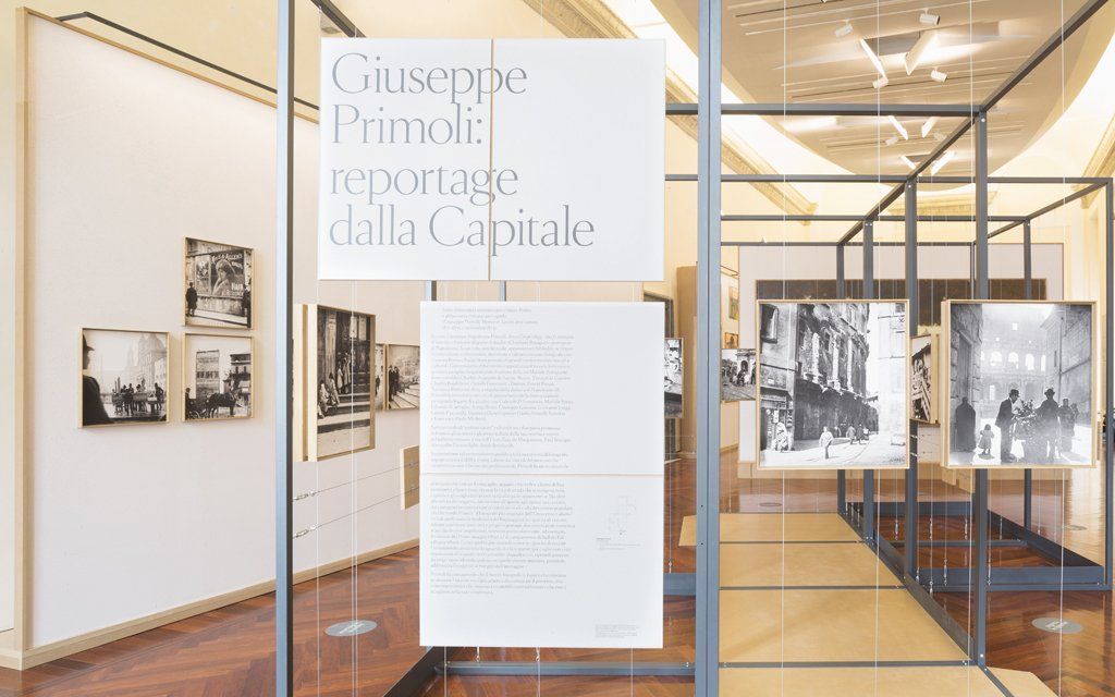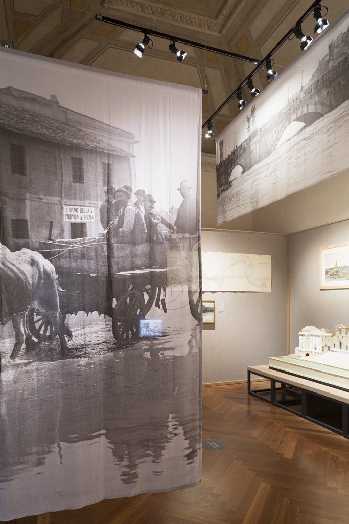 The exhibition seeks to build a direct relationship between the visitors and the people who lived through the transformations of that time. The works are exhibited on wooden walls painted with a special coarse-grained finish, in the colours of the city's plasters and stones, or on wooden tables, lit from within. The exhibition is marked by the presence of light veils suspended under the frescoed vaults of the palazzo, reproducing images of life and people in the city at the end of the 19th century. The project, effective and essential, succeeds in restoring the communicative power of its human context to the heritage on display, bringing it up to date, making it contemporary, taking the visitor into the soul of the Eternal City.