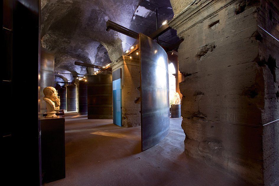 in lamiera forata con un passo serrato che ribatteva la campata strutturale del monumento. Questi supporti metallici, o rocchi, accoglievano, come in una galleria di statuaria, busti, statue e teste di intellettuali e muse, i “protagonisti” della mostra. La sezione dei rocchi, dei “cilindri” rivestiti in lamiera cerata, si dimensionava sulla sezione delle lesene della galleria esterna, oggi quasi del tutto scomparse, che accompagnavano anticamente i pilastri dei fornici esterni: così come le originarie lesene, i rocchi avevano un diametro di circa 92 cm ed erano distaccati di 30-40 cm dalle rispettive strutture murarie. La disposizione in serie di questi basamenti metallici consentiva di rileggere chiaramente il ritmo delle campate strutturali del monumento