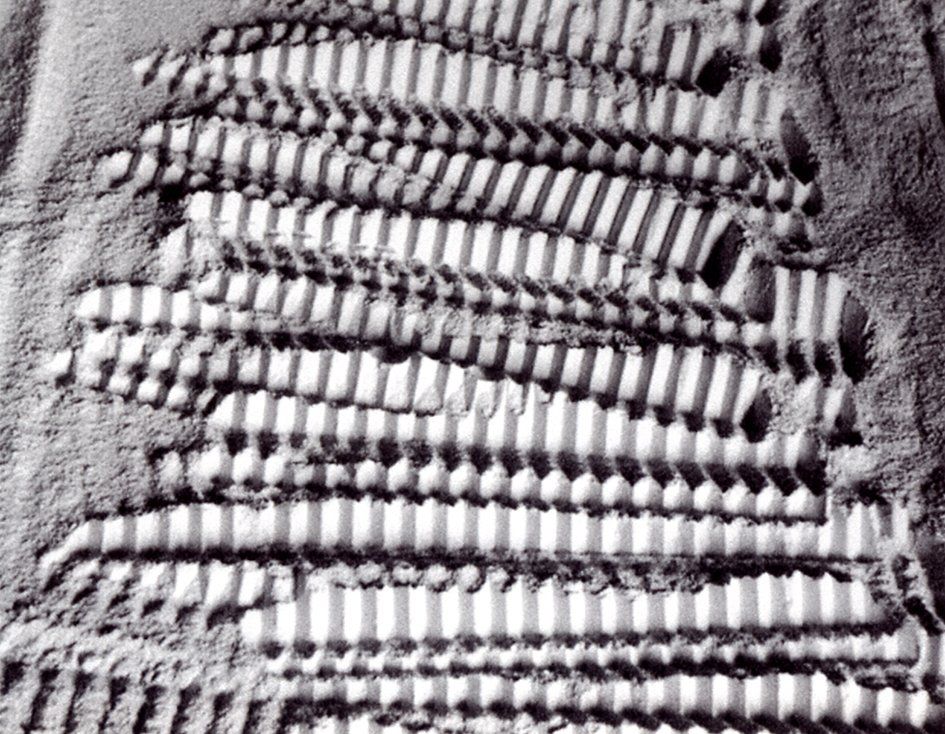 Una macchina scrittoria doveva incidere questa superficie in movimento: una serie di vomeri, lame a pettine, punte di stilo, con movimenti articolati avrebbero disegnato sulla cenere, sfiorandola o incidendola. Il nastro di cenere doveva poi procedere verso il capo opposto della sala, dove sarebbe stato inghiottito e riportato alla sorgente.