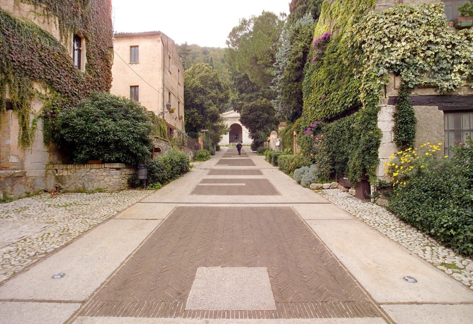 nel borgo, e la prototipazione di un nuovo corpo illuminante appositamente studiato per il complesso monumentale, in modo tale che si armonizzasse con geometrie, passi, ritmi dell’edificio e del suo contesto; furono inoltre realizzati appositi elementi di seduta e di raccolta dei rifiuti, dei pozzetti dei sottoservizi, e fu ripristinata la vegetazione circostante, avvalendosi della consulenza scientifica del paesaggista Ippolito Pizzetti.
