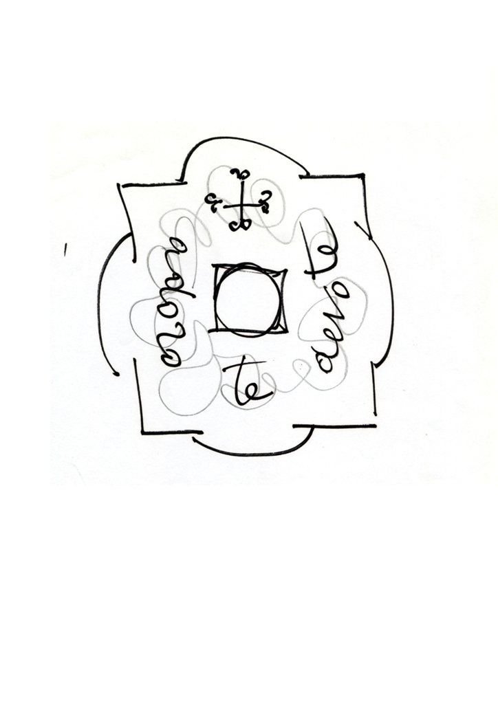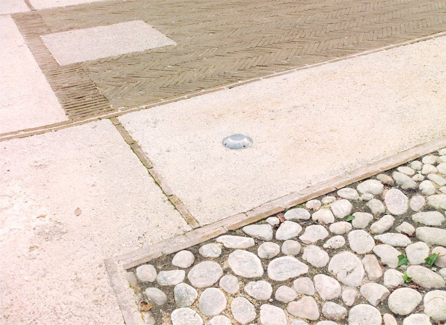 in riquadri centrali di mattoni a coltello, lastre di travertino locale al perimetro e acciottolato ai bordi: tutti materiali già presenti nel complesso monumentale