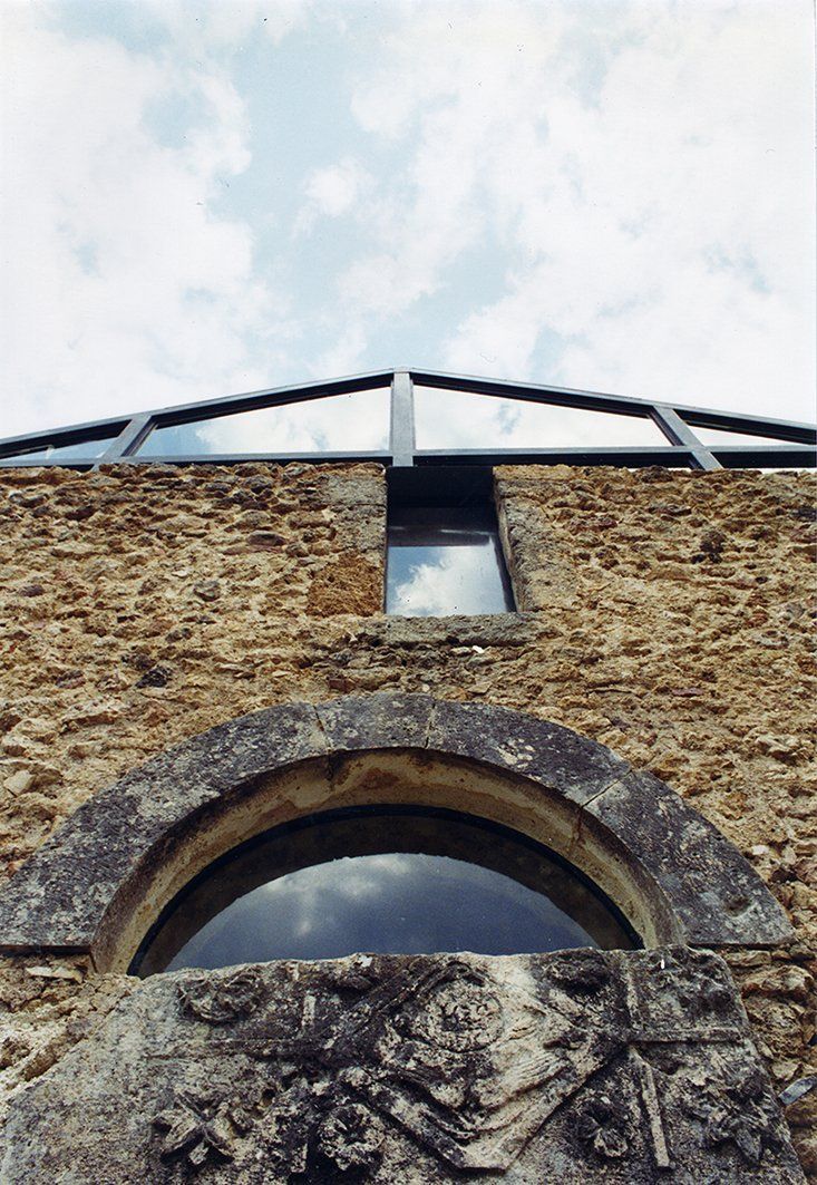reintegrazione volumetrica. Si decise di realizzare una nuova copertura leggera, su semplici capriate metalliche, rivestita da coppi di recupero. Questa copertura non si attesta direttamente sulle creste murarie antiche; al di sotto delle nuove travi perimetrali in metallo, rimane un'asola vetrata che segue il profilo irregolare delle murature. Laddove della fabbrica antica rimane solo il tracciato di fondazione, in corrispondenza dell'abside, l'asola vetrata scende e si fa volume.